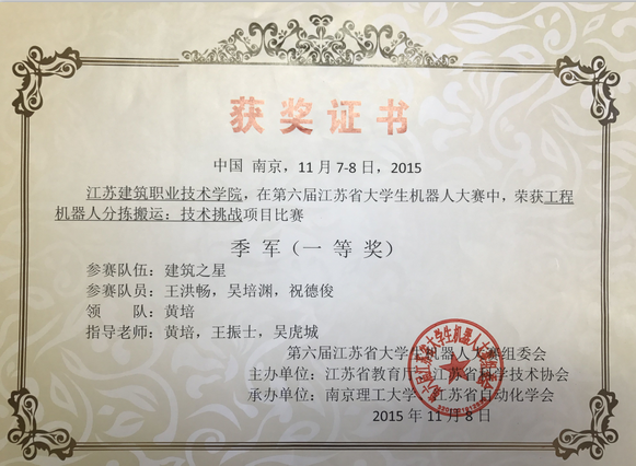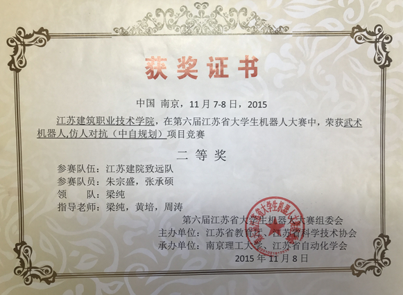 2015年11月第六届江苏省大学生机器人大赛一等奖,二等奖,三等奖