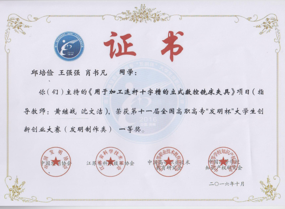 2016年10月第十一届全国高职高专“发明杯”大学生创新创业大赛一等奖