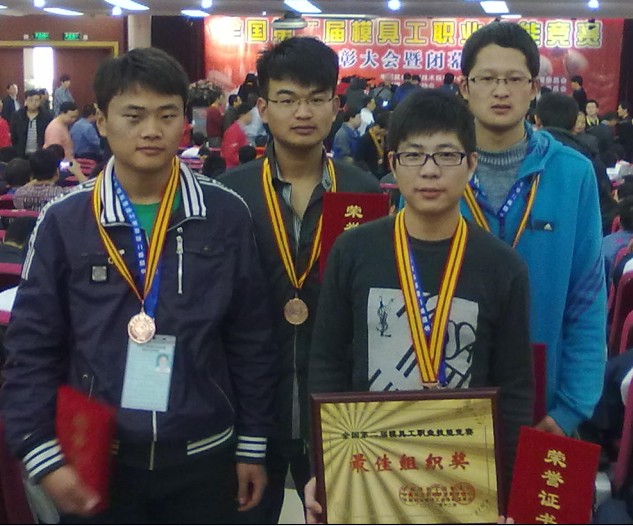 2012年12月全国第二届模具工职业技能大赛获最佳组织奖,学生宋宜超、渠留洋荣获铜牌