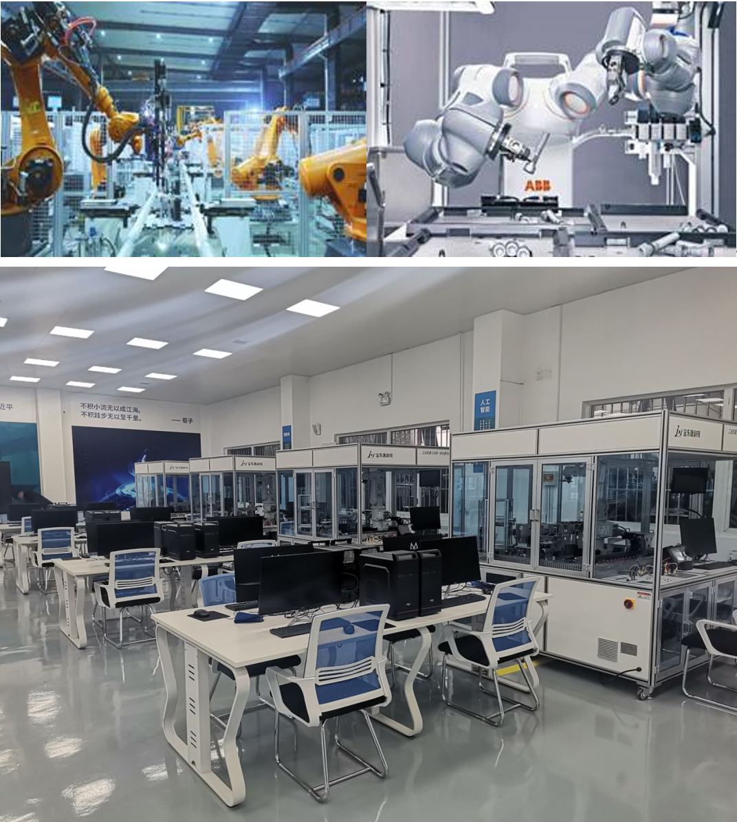 工业机器人作为先进制造业中不可替代的重要装备和手段,已成为衡量一个国家制造业水平和科技水平的重要标志。目前我国正处于加快转型升级的重要时期,以工业机器人为主体的机器人产业,正是破解我国产业成本上升、环境制约问题的重要路径选择。产业的发展急需大量高素质高级技能型专门人才,人才短缺已经成为产业发展的瓶颈。工业机器人技术专业人才被国家列为二十一世纪社会发展最急需的十大专业人才之一。工业机器人技术专业是在光、机、电、自动控制和检测、计算机应用等学科相结合的基础上建立起来的一门综合性应用技术,该专业主要培养能进行工业机器人安装、调试、编程的人才,并具有初步系统设计开发能力的中级工程技术人才。(下图为校内实训场地)