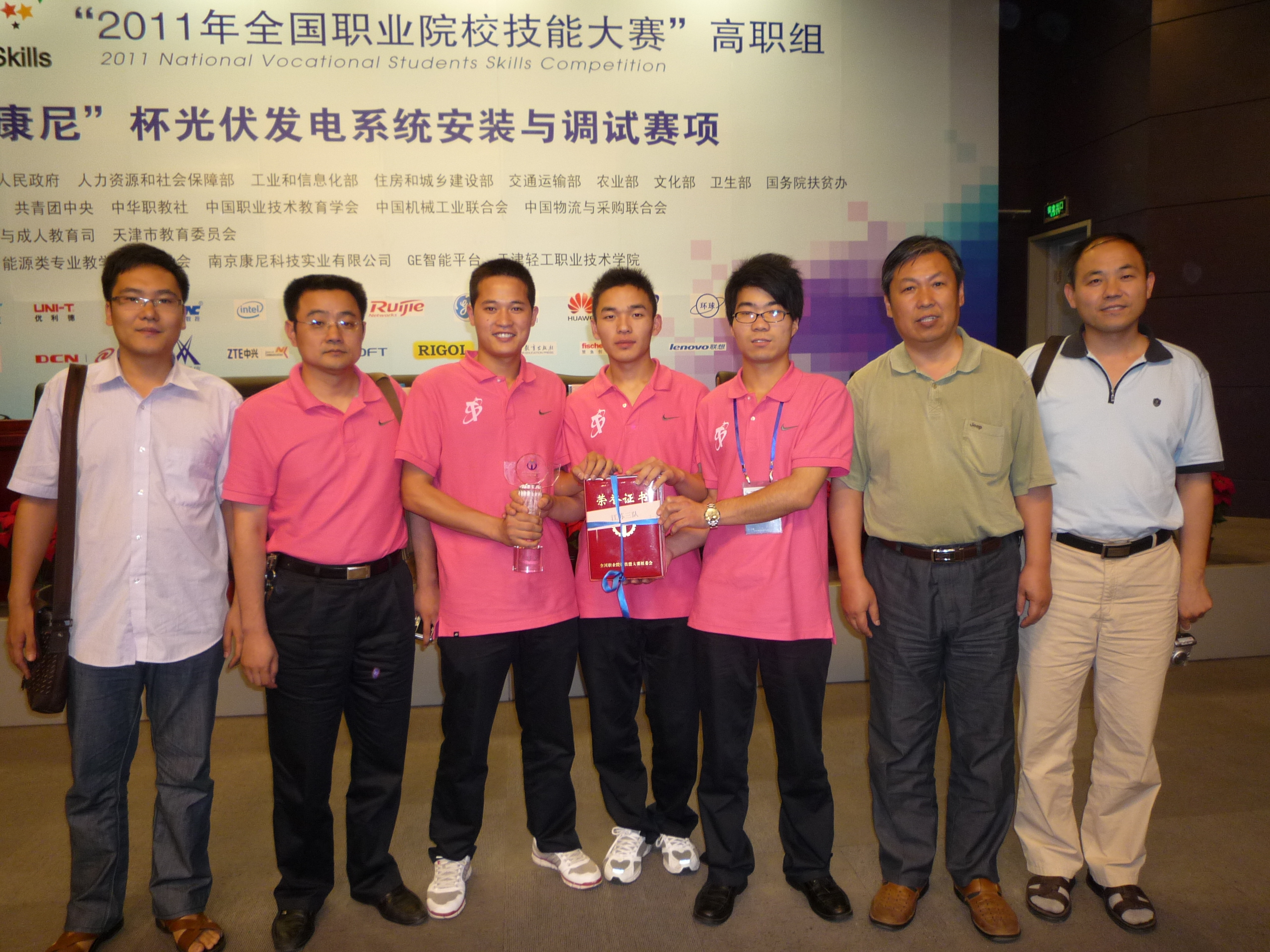 2011年6月在天津举办了由教育部职业教育与成人教育司主办的2011年全国职业院校技能大赛高职组“康尼”杯光伏发电系统安装与调试大赛,本次大赛有全国29个省、市、自治区组成52个代表队参赛,我院代表队由机电学院6名师生组成,经过了6个小时的拼搏,最终获得大赛三等奖,为江苏省及我校取得了荣誉。近日,江苏省教育厅授予我校2011年江苏省职业院校技能大赛先进单位荣誉称号。