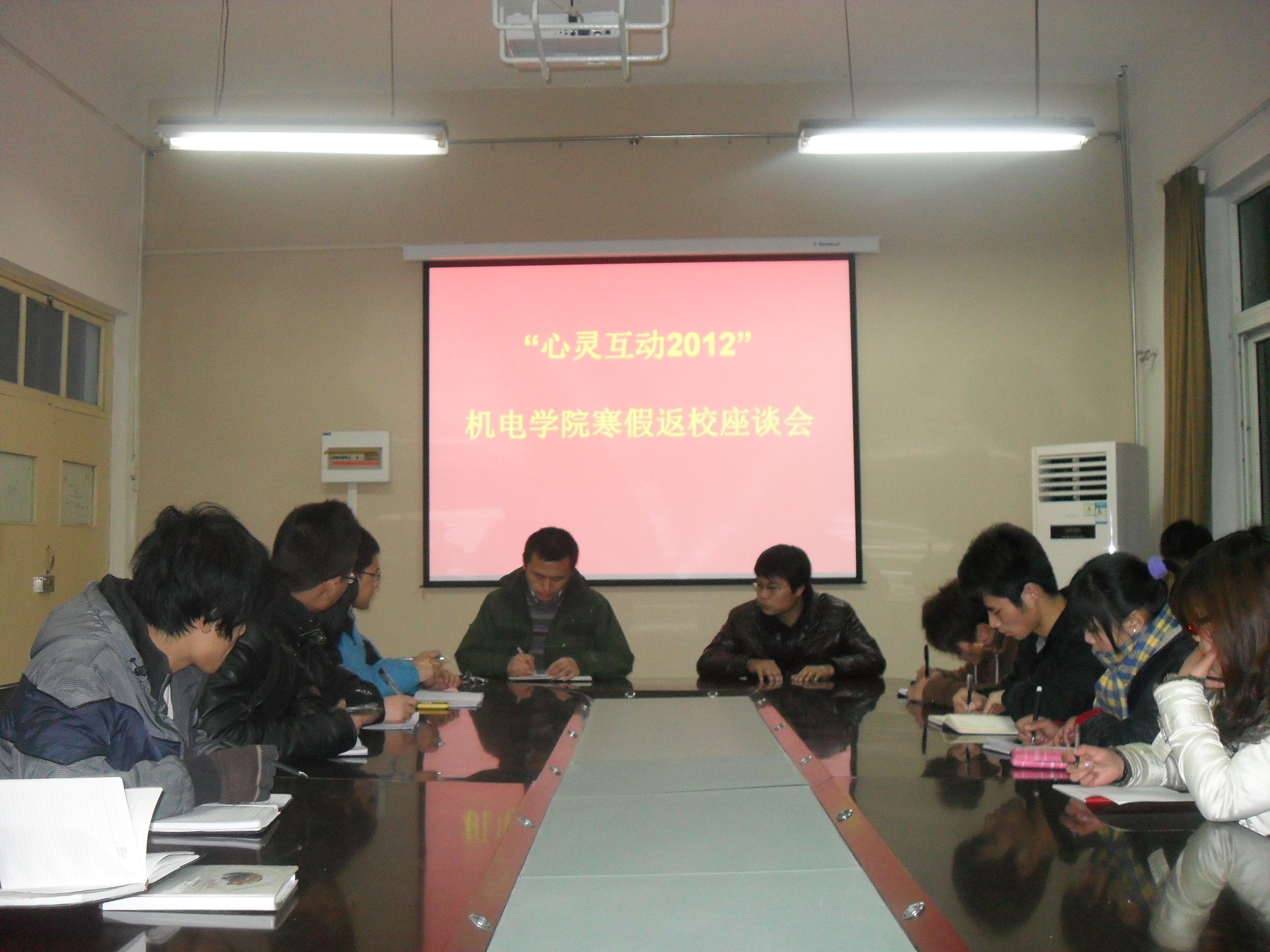 为切实做好返校学生思想状况调查工作,按照校团委的统一要求,机电学院于2月23日晚举行了“心灵互动2012”寒假返校学生思想状况座谈会。专职辅导员胡兵老师出席,学院10、11级学生代表40余人参加,会议由分团委书记吴文辉老师主持。