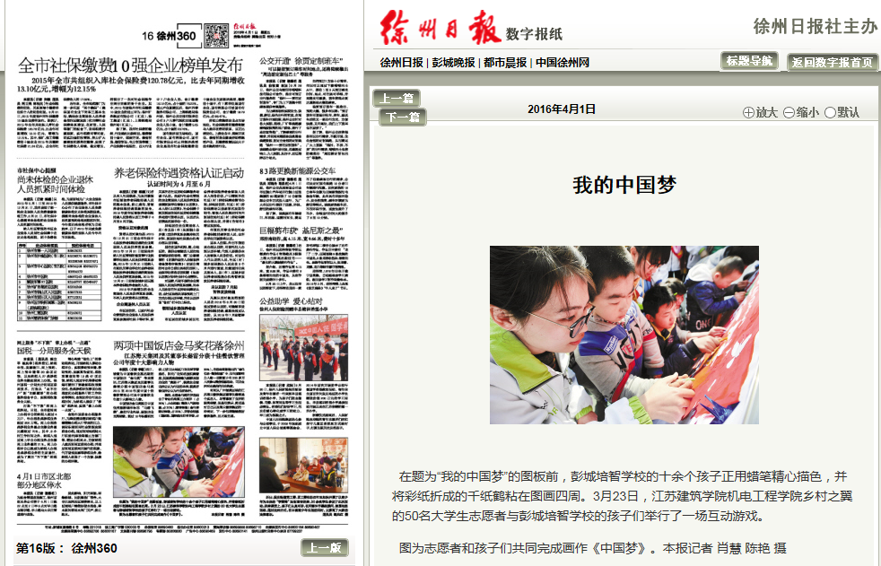 《徐州日报》关注我院乡村之翼志愿者关爱智障儿童--共绘我的中国梦互动活动