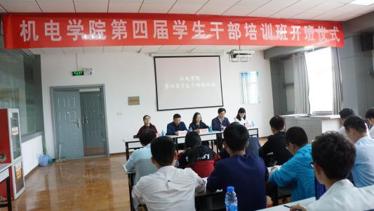 为了提升干部学生的综合素质,增强学生干部队伍的凝聚力和战斗力,机电工程学院于4月14日下午4:00在机电工程学院工业中心二楼举办了机电学院第四届学生干部培训班暨学生干部培训课程。校团委副书记陈昕、学工处副处长周厚思、机电党总支部副书记鹿毅、分团委书记邵明颖,专职辅导员郭利应邀参加了此次开班仪式。
