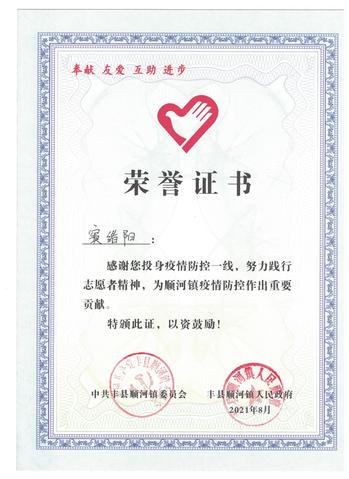 近日,新利18官方网站多少收到徐州市丰县顺河镇蔡庄村的一封感谢信及荣誉证书一份。来信中表扬了在抗击疫情期间,新利18官方网站多少机电20-5班窦绪阳同学,在蔡庄村最缺人手的时候主动承担志愿工作,参加核酸检测培训、信息登记、并到活动不方便村民家上门采集核酸,每天工作达10个小时,服务村民3000人次,披星戴月整整工作了一个周的优秀事迹。该生的事迹得到当地村民和领导的认可,徐州市丰县顺河镇人民政府为该生邮寄了荣誉证书,对其投身疫情防控一线、努力践行志愿者精神的行为表示感谢和鼓励!