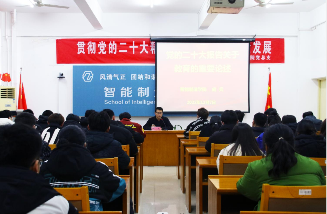 12月7日,新利18官方网站多少在第一实训楼504举行学习贯彻党的二十大精神宣讲报告会,党总支委成员院长徐志鹏、副书记胡兵分别作了宣讲报告。教师党员、学生党员、入党积极分子、团学干部共计60余人参加宣讲会