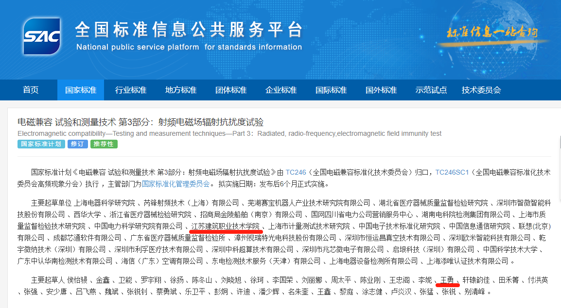 近日,以我校作为起草单位、新利18官方网站多少王勇教授作为起草人的国家标准《电磁兼容 试验和测量技术 第3部分:射频电磁场辐射抗扰度试验》 (GB/T 17626.3-2023)正式发布,将于202471日起正式实施,这是我校首次参与国家标准的起草工作。