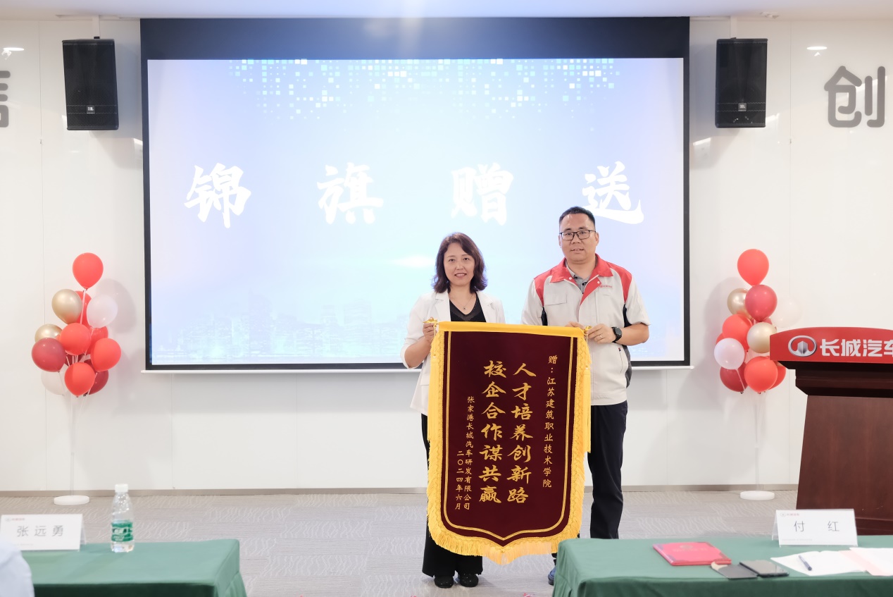 张家港长城汽车研发有限公司综合管理部部长李保华做了结业班培训情况总结,统括部部长董彦龙为我校颁发了锦旗,鹿鹏程、张端军两位老师被评委培训优秀教师。