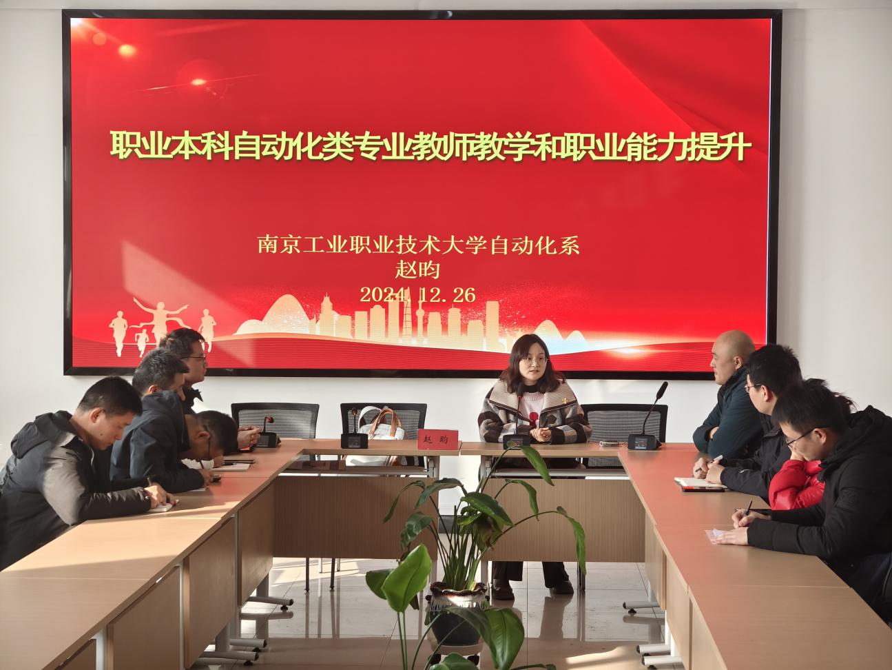 为提升我院青年教师教学和职业能力,更好适应未来职业本科层面教学。2024年12月27日,我院邀请南京工业职业技术大学自动化专业赵昀主任为我院青年教师开展题为《自动化类专业教师教学和职业能力提升》的报告会。赵昀主任就自动化技术专业的课程体系优化、教学方法创新、教学资源建设、深化产教融合、教学评价改进等方面进行了深入浅出的报告分享,会后我院青年教师与赵昀主任进行了充分的交流研讨。通过此次活动,我院青年教师受益匪浅,不仅拓宽了视野,对个人发展规划更加清晰明了,而且增进了对职业本科专业建设的了解。