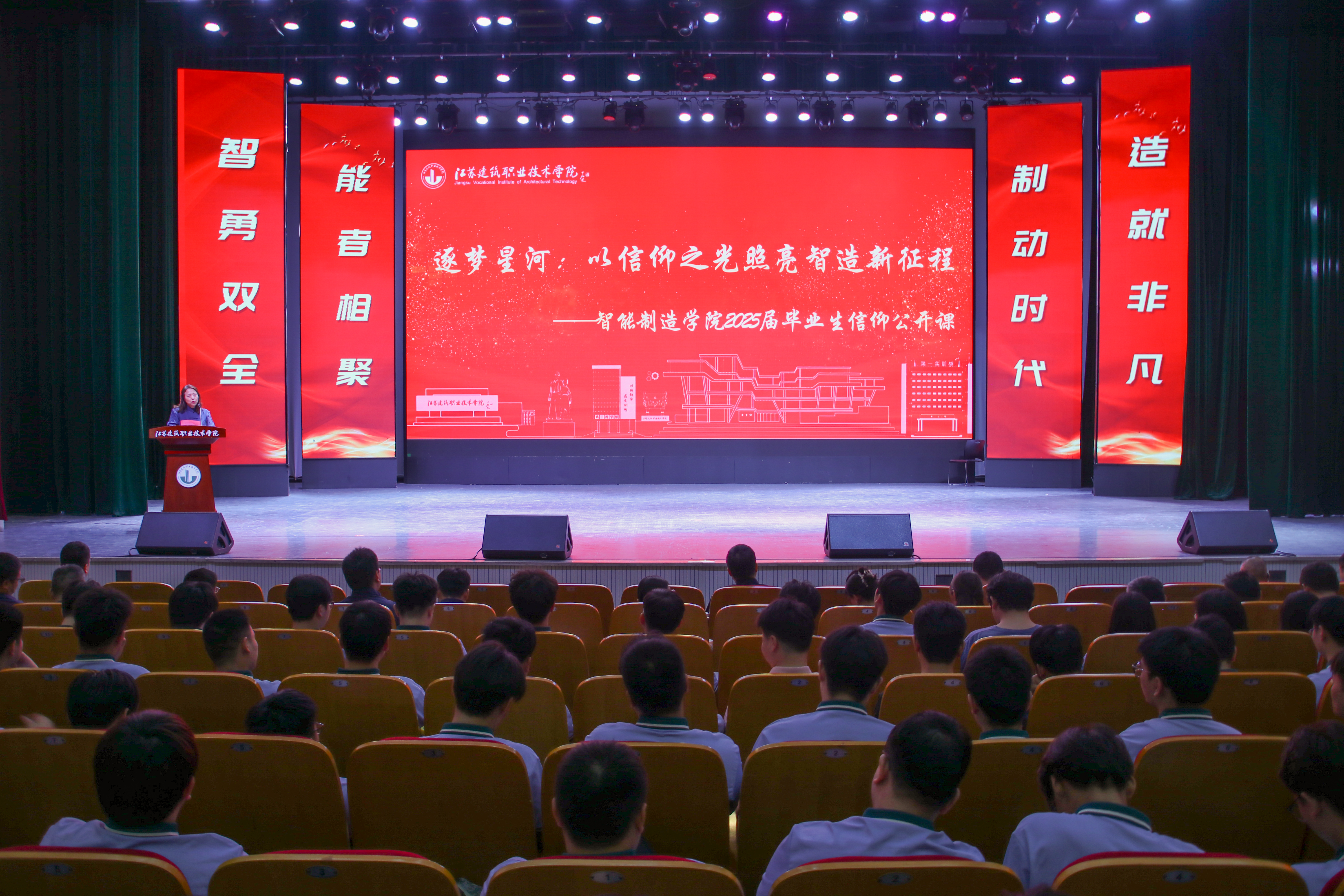 付红以《逐梦星河:以信仰之光照亮智造新征程》为题,为毕业生讲授离校前的最后一课。她结合智能制造产业的新趋势,从技术创新、产业需求与国家战略三个维度出发,激励毕业生保持创新精神,将个人理想融入“中国智造”强国征程。据悉,学院信仰公开课体系已成为培育学生职业精神的重要平台,近年来已助力98.7%的毕业生进入徐工集团、博智林机器人等龙头企业就业,多数人迅速成长为技术骨干,形成“课堂铸魂—岗位践行—反哺传承”的良性育人循环。